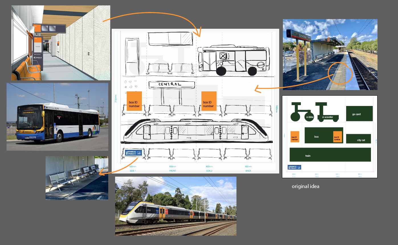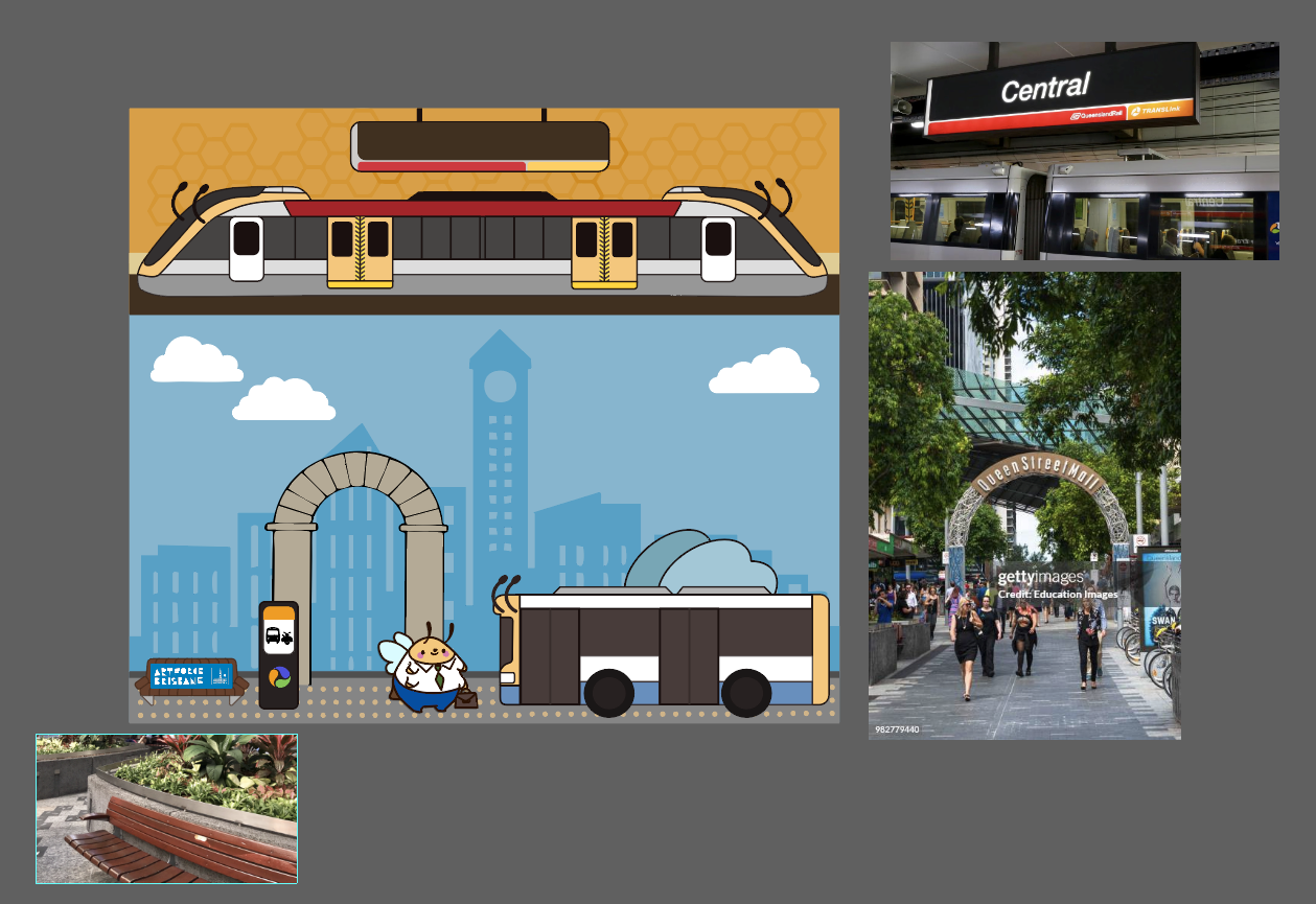 Below, I explore how Brisbane’s transport elements informed the design of Central Hive. Growing up in Brisbane, Queen Street was always a place where everything seemed to converge—a central hub where people “buzzed” in and out. This became the foundation for the busy bees concept, representing movement, community, and connection.